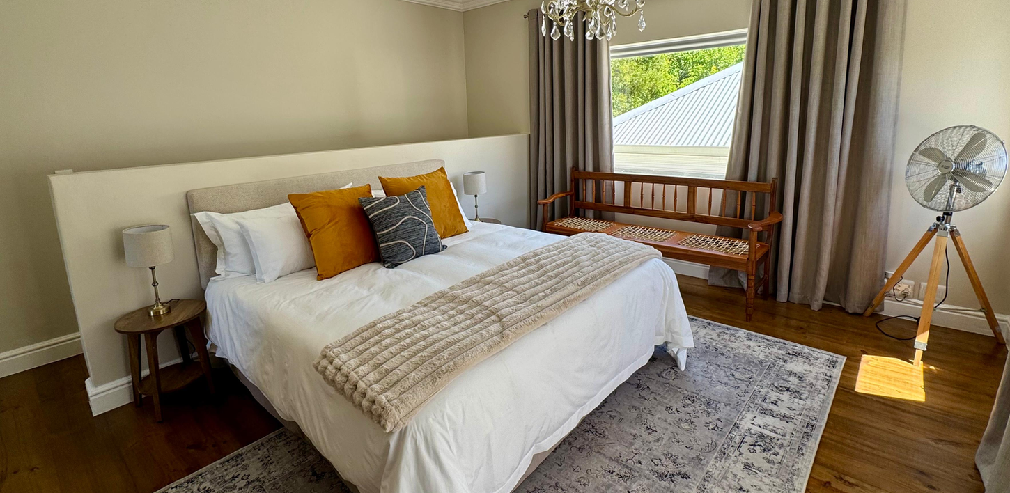 Offers a queen-size extra-length bed with doors opening onto the garden and pool area, for a tranquil and comfortable stay.